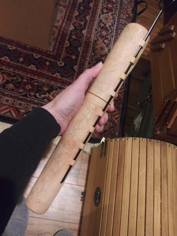 Fortunately, I had been assembly-lining another recorder case two steps behind this one, thinking to throw it up on my etsy after. So I had an entire extra interior already assembled, as well as an exterior layer already cut to size but not skived. I skived it and carved the lines, with the correct overlap position this time. The second attempt was a go!