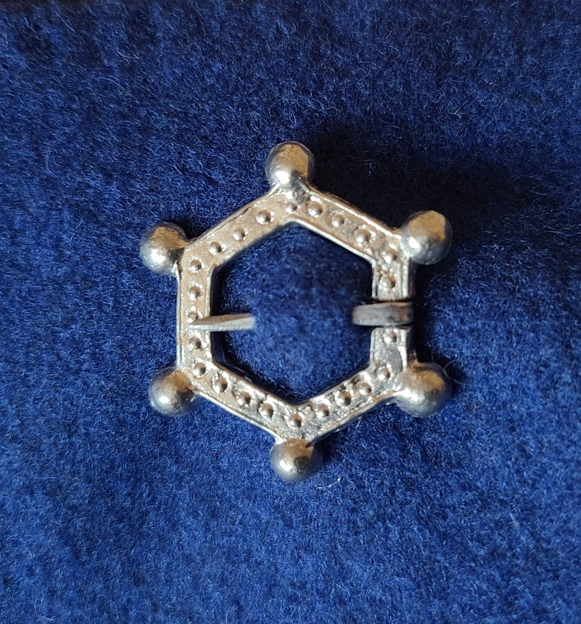 I used this same process to make the hexagon brooches pictured below. These are also based off image number 1346 in Dress Accessories. The pin is made out of stainless steel wire for strength. The brooch these are based off of has lost its pin, but there have been other brooches found with a harder metal for the pin than the brooch itself is made out of. I was worried that a pewter pin would bend and become unusable too quickly.